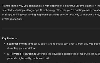 ด้วยอินเทอร์เฟซที่ใช้งานง่าย Rephraser ช่วยให้ผู้ใช้สามารถเน้นข้อความและรับข้อเสนอแนะการปรับเปลี่ยนทันที ทำให้เป็นเครื่องมือที่มีค่าสำหรับชุดเครื่องมือของนักเขียน ส่วนขยายนี้ถูกออกแบบมาเพื่อเพิ่มความสามารถในการอ่านโดยรวม เพื่อให้แน่ใจว่าข้อความที่ตั้งใจจะสื่อสารนั้นถูกส่งต่ออย่างชัดเจนและเป็นมืออาชีพ สิ่งนี้ทำให้ Rephraser เป็นเครื่องมือที่สะดวกสำหรับนักเรียน มืออาชีพ และผู้ที่ต้องการยกระดับการสื่อสารด้วยการเขียนของตนเอง.